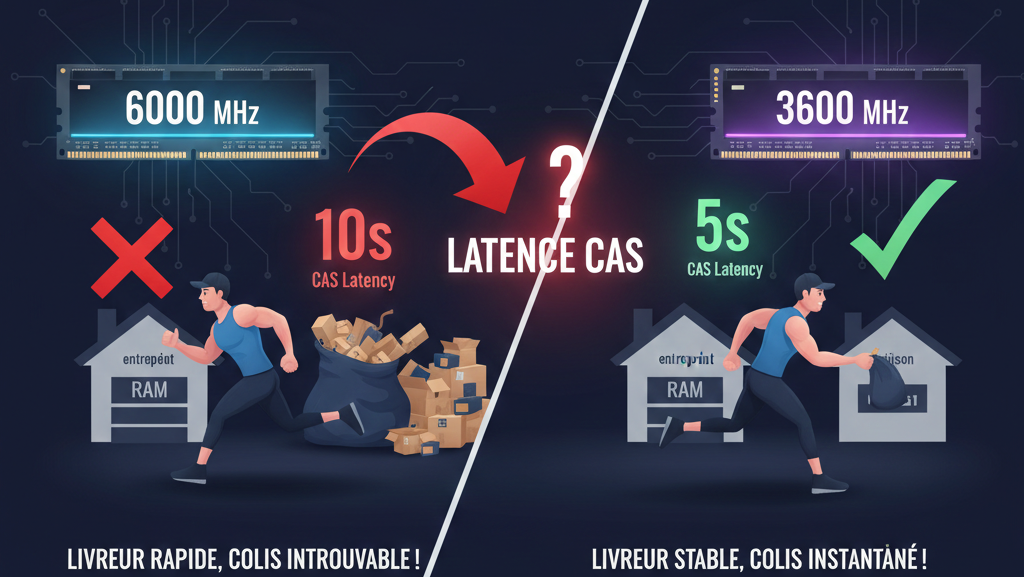 Pour vulgariser, imaginez que la fréquence est la vitesse de déplacement d’un livreur Amazon. Plus la fréquence est élevée, plus le livreur court vite entre l’entrepôt (la RAM) et votre maison (le Processeur). Super, non ? Sauf qu’il y a un piège. Si ce livreur court comme Usain Bolt mais met 10 minutes à trouver le colis dans son sac à chaque arrêt, il sera finalement moins efficace qu’un livreur qui trottine mais qui vous tend le paquet instantanément.